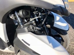 O sistema dianteiro de bielas em paralelogramo funciona na perfeição e ao contrário dos sistemas mais sofisticados das Piaggio que incluem electrónica na gestão do funcionamento dos mesmos e que de vez em quando pregam algumas partidas, o da Tricity é totalmente mecânico, simples e muito eficaz.