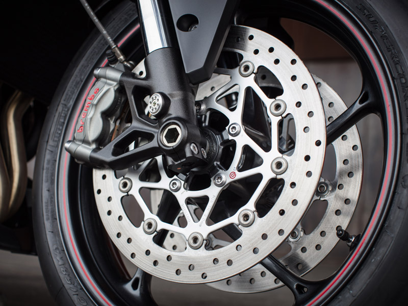 Na versão RS o amortecedor traseiro é um fantástico Ohlins SXT40 e a suspensão invertida na dianteira é uma Showa de 41mm e monta uns eficientes travões radiais da Brembo modelo M50. Surpreendente é também o seu peso de apenas 166 Kg.