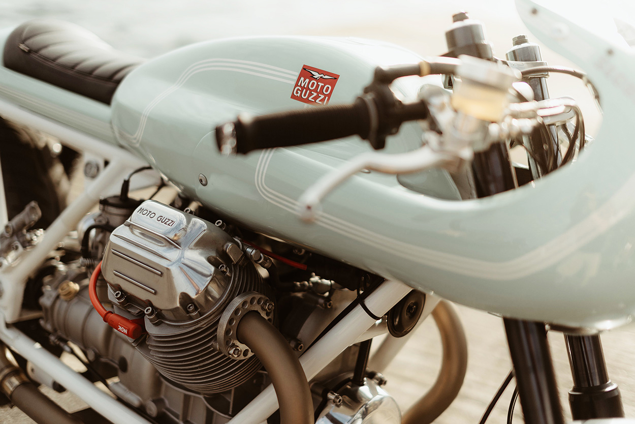 Quanto à pintura, optaram por um estilo italiano “Old School “ como o das “MotoBianchi” tendo sido reproduzido as próprias sombras . O famoso verde “Celeste” foi variando ao longo das décadas, de um verde intenso menta para um azul coral deslavado, mas o turquesa pálido que finalmente aplicaram na V1000 assenta-lhe como “uma luva”. Sabe-lhe tão bem como um gelado de Pistacho num dia de calor… afirmaria Manuel