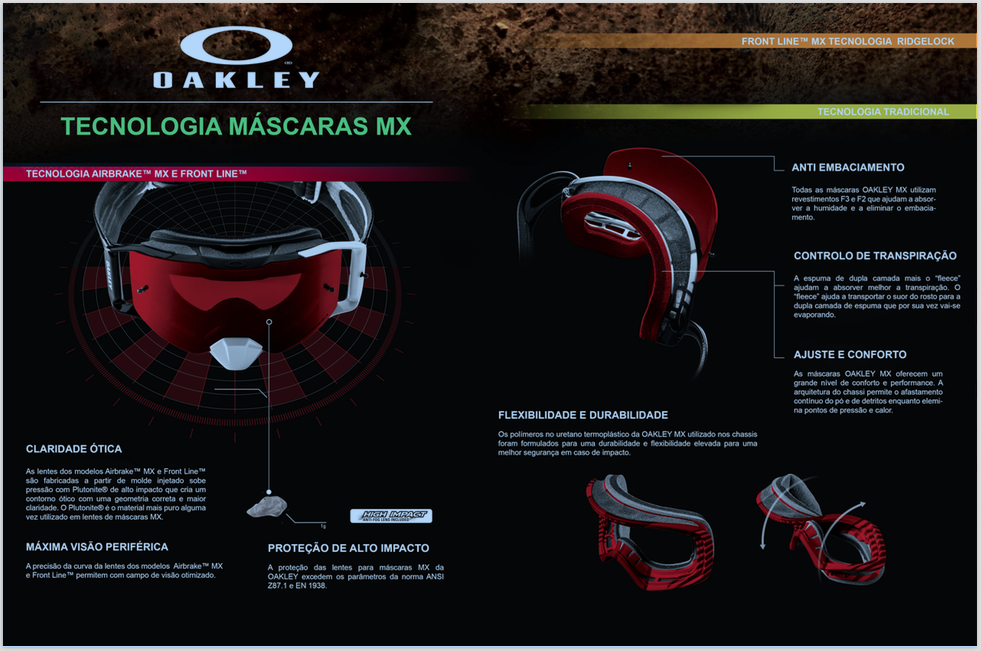 Numa corrida cada fracção de segundo conta e a Oakley sabe disso. Nas últimas décadas as máscaras de MX Oakley sofreram várias evoluções tecnológicas fazendo com que as máscaras comuns se tornassem obsoletas.