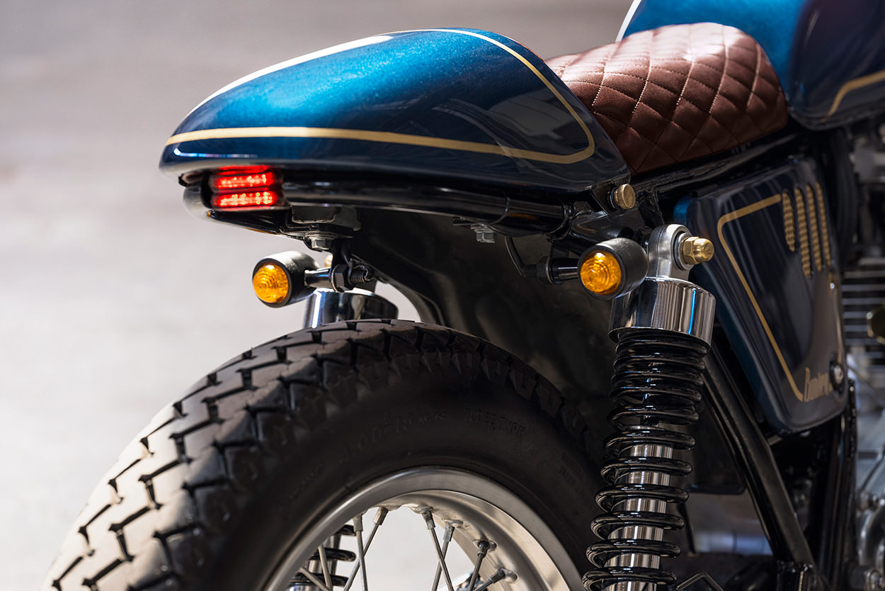 Em termos mecânicos a intervenção da Bunker limitou-se ao escape, agora mais curto, e à montagem de filtros KN e de um Power Comander em termos electrónicos. Os conta kms e rotações deram lugar a um pequeno manómetro e o guiador é agora um Renthal largo e baixo ao estilo “Road & Low”. Um farol redondo clássico de 5” e uns piscas minimalistas com LEDs completam a preparação.