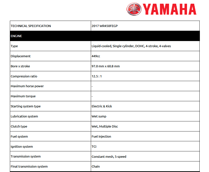 Yamaha WR 450F de 2018 – Ficha Técnica